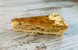 Состав: яблоки, сок яблочный , мука пшеничная, маргарин, сахар, меланж яичный, молоко цельное пастеризованное, смесь для приготовления заварного крема(молоко сухое цельное, загуститель(Е14140),мальтодекстрин, стабилизаторы(Е401),ароматизатор пищевой, краситель(Е160а) ,гель нейтральный зеркальный (сироп глюкозный, сахар, загустители (агар , пектин)),каби (загуститель),изюм ,крахмал кукурузный ,желатин, регулятор кислотности (лимонная кислота).